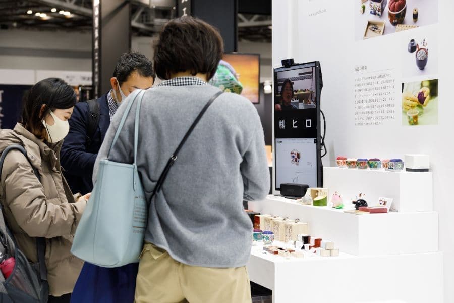 今回のイベント形式では、商品のみ東京・新橋の会場に設置し、出展者自身は奈良県の各地にある自社にて対応を行います。その方式にオンラインを採用。モニターを縦型にし、その上にWEBカメラを設置した形式は、東京の会場にいる来場者の目線と出展者の目線を同じにし、会話をしやすくしています。この手法は、プロデュース会社であるスーパーペンギンがこれまで様々な展示会でこのような形式を試した結果辿り着いた商談の手法。画面越しでもなるべく自然な形で会話ができるようなシステムの工夫を行っています。また、奈良県の各所にいる出展社にも、事前に行ったセミナー(昨年12月開催)にて、待機方法や話しかけ方を解説。待機する時は、画面に向かって待ち構え過ぎず、さりげなく作業を行いながら待つこと。また、話しかける時には「録画ではなくリアルであること」が来場者に分かるよう、「相手の服装を褒めて気を引く」ことなど、声の掛け方のポイントを事前にお伝えしています。